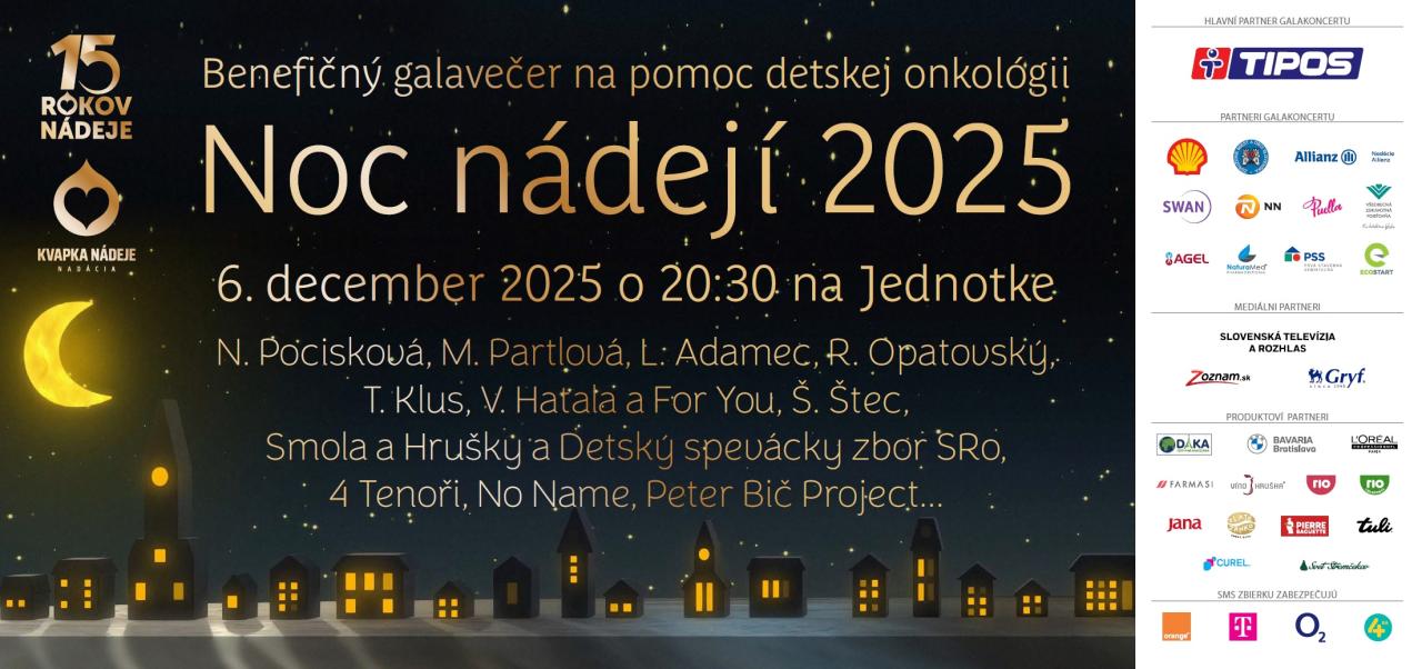 Nadácia KVAPKA NÁDEJE a Združenie miest a obcí Slovenska organizujú 16. ročník benefičného podujatia „Noc Nádejí“ v spolupráci so Slovenskou televíziou STVR na Jednotke.