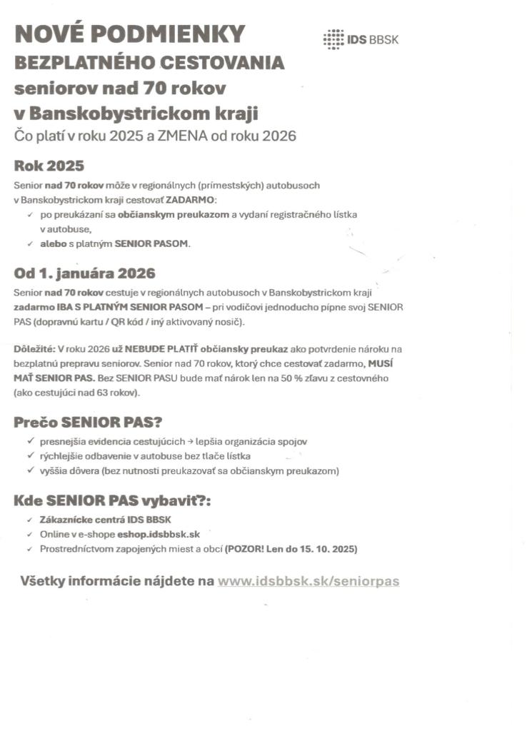 Od 1. januára 2026 budú seniori nad 70 rokov cestovať v regionálnych (prímestských) autobusoch v Banskobystrickom kraji ZADARMO len s dopravnou kartou SENIOR PAS.