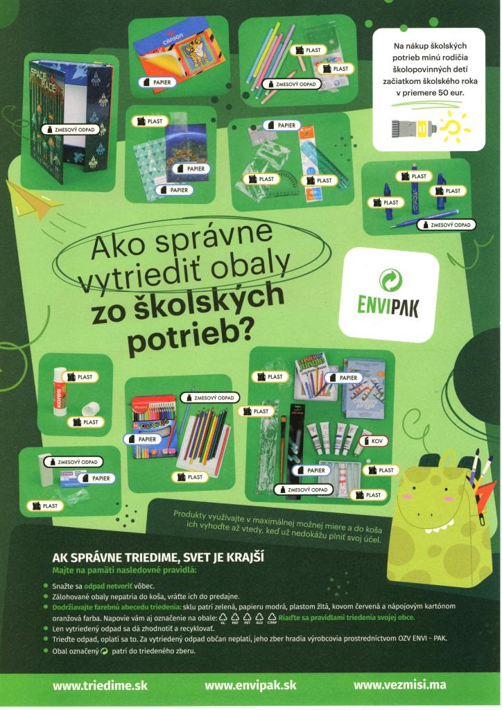 Školský rok sa začne už o pár dní, a zatiaľ čo pre deti to znamená nový kolotoč úloh a povinností, rodičia premýšľajú, aké školské potreby budú v novom ročníku ich ratolesti potrebovať. Od zošitov, písacích potrieb až po gumy, strúhadlá, pravítka či ďalšie pomôcky. Začiatok školského roka so sebou prináša aj množstvo odpadu, najmä z obalov, v ktorých sú školské potreby balené. My v OZV ENVI - PAK upozorňujeme na dôležitosť správneho triedenia týchto pomôcok a obalov z nich – nielen na začiatku, ale počas celého školského roka.