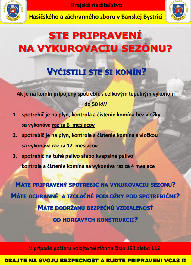 V súvislosti s príchodom chladného počasia s ktorým súvisí aj nástup vykurovacieho obdobia Vás Okresné riaditeľstvo Hasičského a záchranného zboru v Brezne ž i a d a v súlade s § 21 písm. j) a l) zákona č. 314/2001 Z. z. o ochrane pred požiarmi v znení neskorších predpisov (ďalej len „zákon č. 314/2001 Z. z.“) o prijatie opatrení súvisiacich s uplatnením kompetencií obce v rámci preneseného výkonu štátnej správy v zmysle § 23 ods. 1 písm. a) zákona č. 314/2001 Z. z. Predmetnú žiadosť zdôvodňujeme každoročným nárastom počtu výjazdov k požiarom rodinných domov, resp. k požiarom v bytovom fonde v čase vykurovania. Za prvých 9 mesiacov tohto roka nevyhovujúci technický stav alebo porucha vykurovacích telies, dymovodov a komínov spôsobila 14 požiarov s priamou škodou vo výške 11.700,- eur. Najčastejšími príčinami vzniku týchto požiarov boli nevyhovujúci technický stav dymovodov a komínov (vyhorenie sadzí v komíne), nesprávna inštalácia a umiestnenie vykurovacích telies (dymovodov) a iná porucha vykurovacích telies, dymovodov a komínov. Okrem uvedených príčin do popredia vystupuje i nedbalosť a neopatrnosť pri manipulácií s otvoreným ohňom, horľavými látkami a žeravým popolom, nedodržanie bezpečných vzdialeností horľavých materiálov od konštrukcií vykurovacích telies a používanie iného paliva (v množstve a druhu) pre aké je spotrebič konštrukčne vyhotovený. Za účelom predchádzania vzniku požiarov v obytných domoch a iných objektoch je dôležité vykonávať kontroly technického stavu vykurovacích telies ešte pred ich použitím, inštalovať ich podľa návodu výrobcu, dbať na ich pravidelnú kontrolu počas prevádzky a sypať popol do nehorľavých nádob.